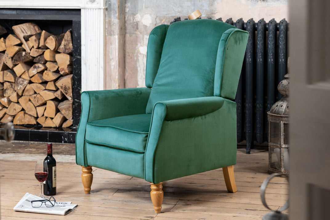 The Carlisle Recliner is a manual push-back armchair designed for ultimate relaxation. Upholstered in soft velvet and available in a stunning array of colours, it complements any living space. The light wooden legs and wing-back design add a touch of classic elegance, while the rolled arm design enhances comfort. Easy to assemble, the Carlisle Recliner is the perfect addition for those seeking a cosy and stylish seating option.